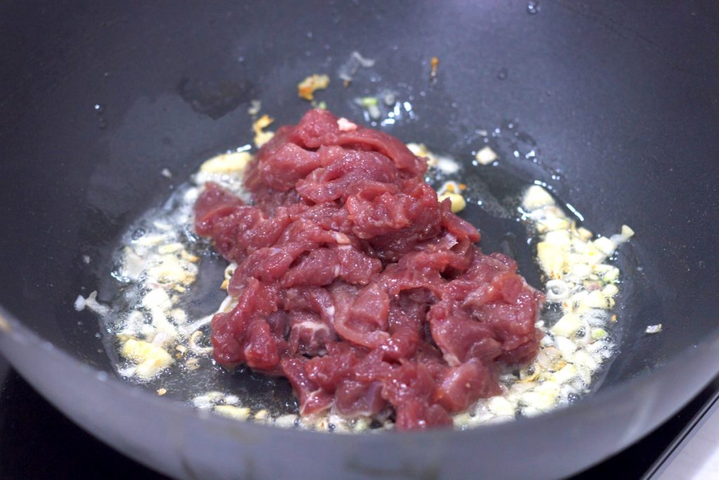 – Cho ½ chỗ hành, tỏi vào chảo, phi thơm, rồi cho thịt bò vào xào nhanh tay đến khi thịt chín tái, trút ra đĩa, để riêng.
